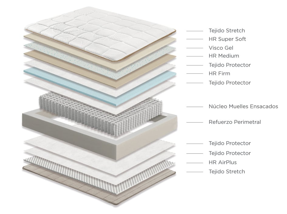 En su cara superior cuenta con acolchado de ViscoGel, adaptable y termosensible y varias capas de HR Supersoft, Medium y Firm, que lo hacen más confortable y duradero. Su cara inferior solo cuenta con el acolchado HR AirPlus, para que el colchón sea más transpirable. Tapizado en Tejido Stretch, elástico, transpirable y duradero.