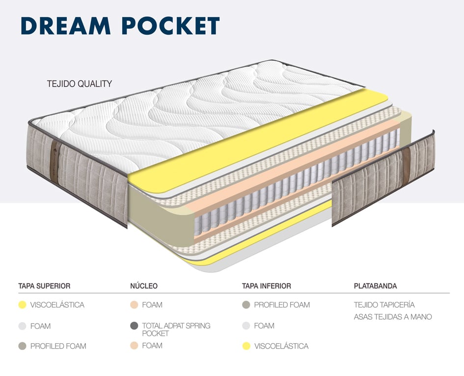 El colchón Dream Pocket de Hilding Anders cuenta con un núcleo de muelles ensacados Spring Pocket, que le otorga independencia de lechos y elimina los puntos de presión. Está acolchado por ambas caras con capa de Viscoelástica, adaptable a la forma del cuerpo, y Foam Perfilado, que da transpirabilidad y ergonomía. Está tapizado con Tejido Quality y tiene un grosor de 27 cm. Se trata de un colchón con una firmeza medio-dura, 4 sobre 6. Por sus materiales y características puede soportar a durmientes de hasta 140 Kg.| Dimensiones | N/D |