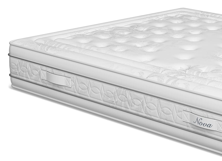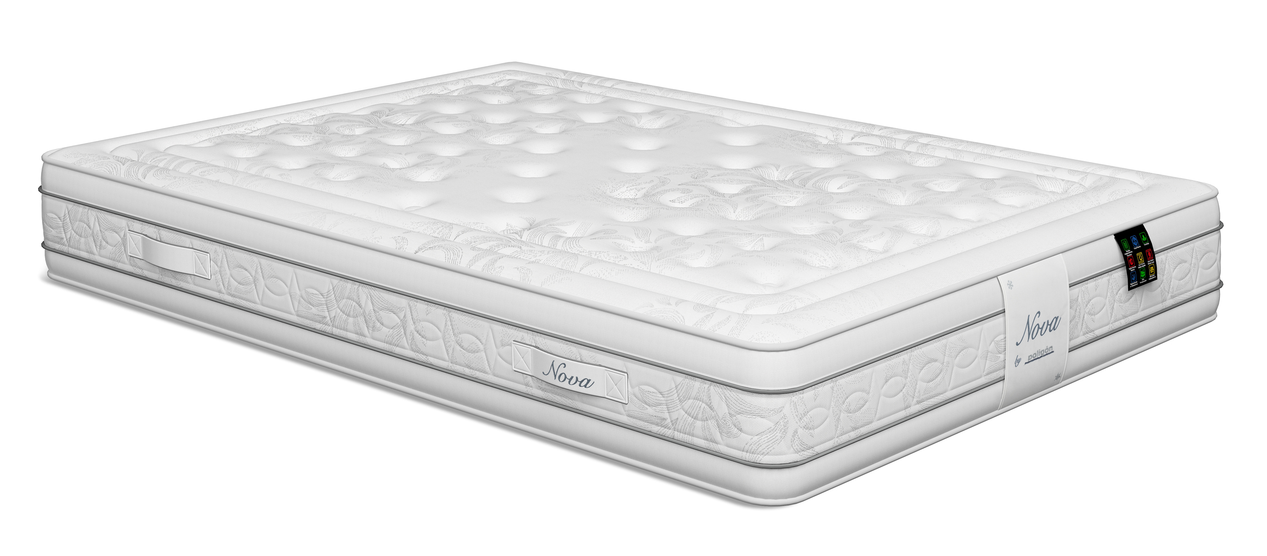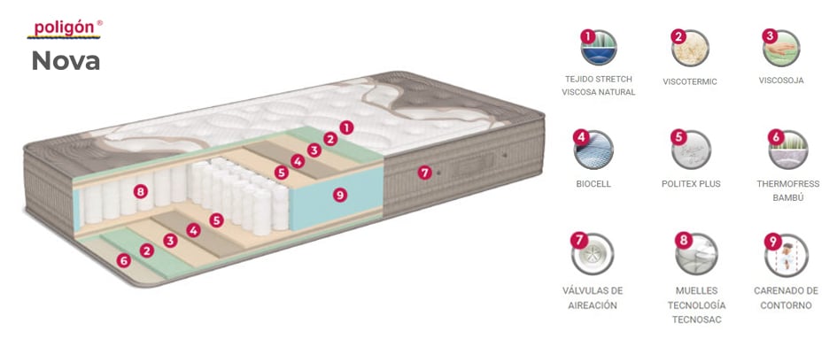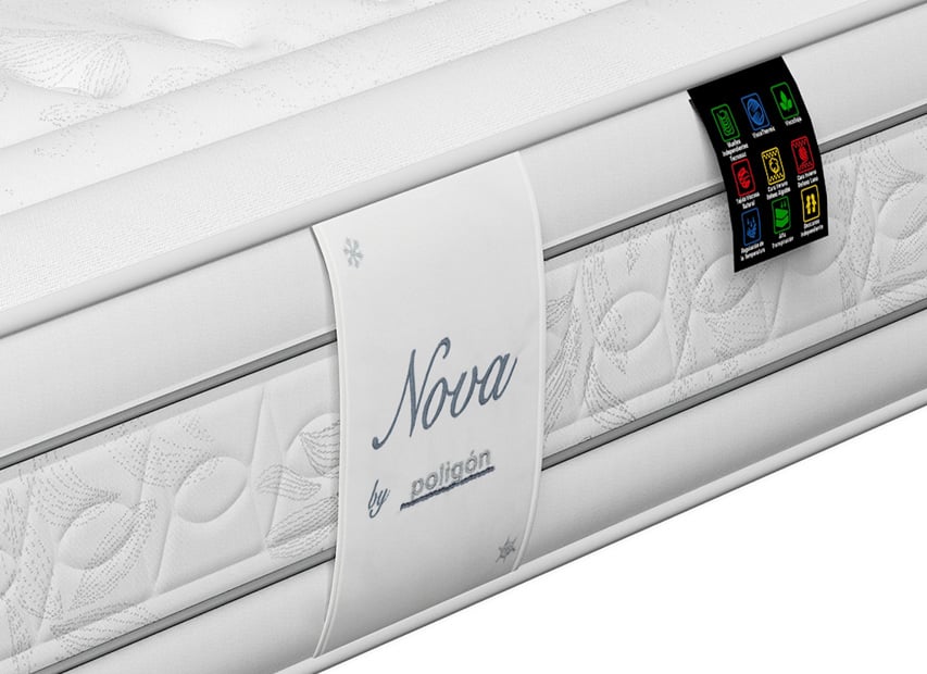 El colchón Nova de Poligón cuenta con un núcleo de muelles ensacados Tecnosac con 5 zonas de descanso. Bloque reforzado con placas de poliuretano que lo hacen más duradero. Sus acolchados con materiales de alta calidad, lo hacen adaptable y transpirable. Cuenta con una cara con tapizado de verano y la otra con tapizado de invierno. Tiene una firmeza de 4 Alta sobre 6, por lo que lo consideramos medio-duro y un grosor de 29 cm. Además cuenta con tratamiento antiácaros que lo hace hipoalergénico e higiénico. Por sus materiales y características, es adecuado para durmientes de hasta 135 kg.| Dimensiones | N/D |