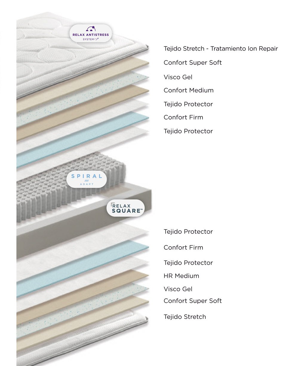 Acolchado en ambas caras con Viscogel, adaptable y termoregulador, y Confort Supersoft, Medium y Firm, combinación de espumaciones que aportan estabilidad y confortabilidad. Tapizado con tejido Strech con Ion Repair, sistema Relax Antistress.
