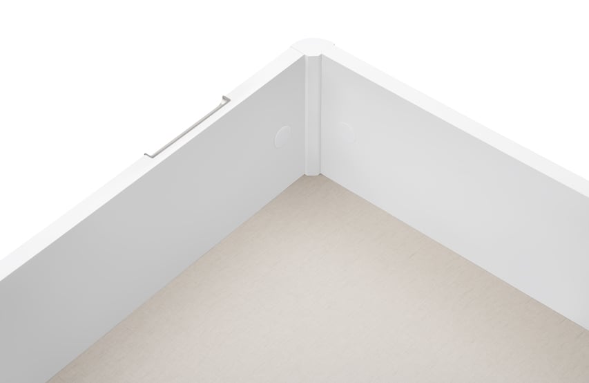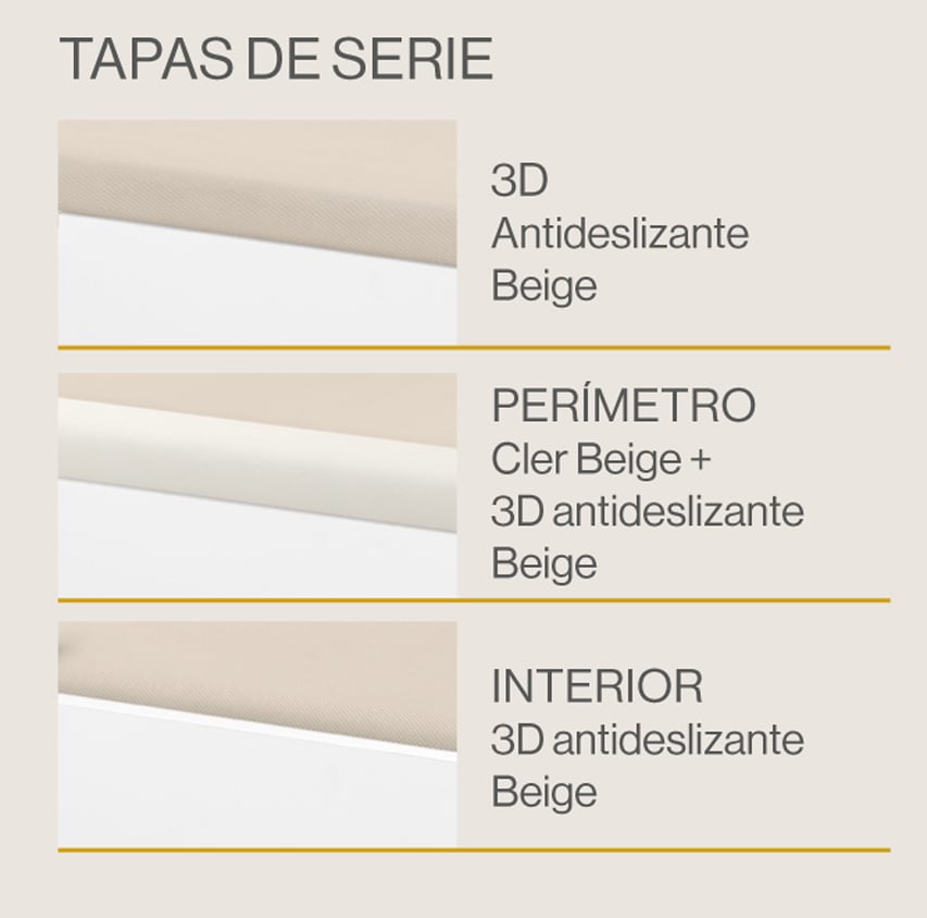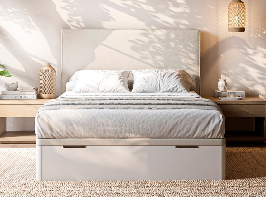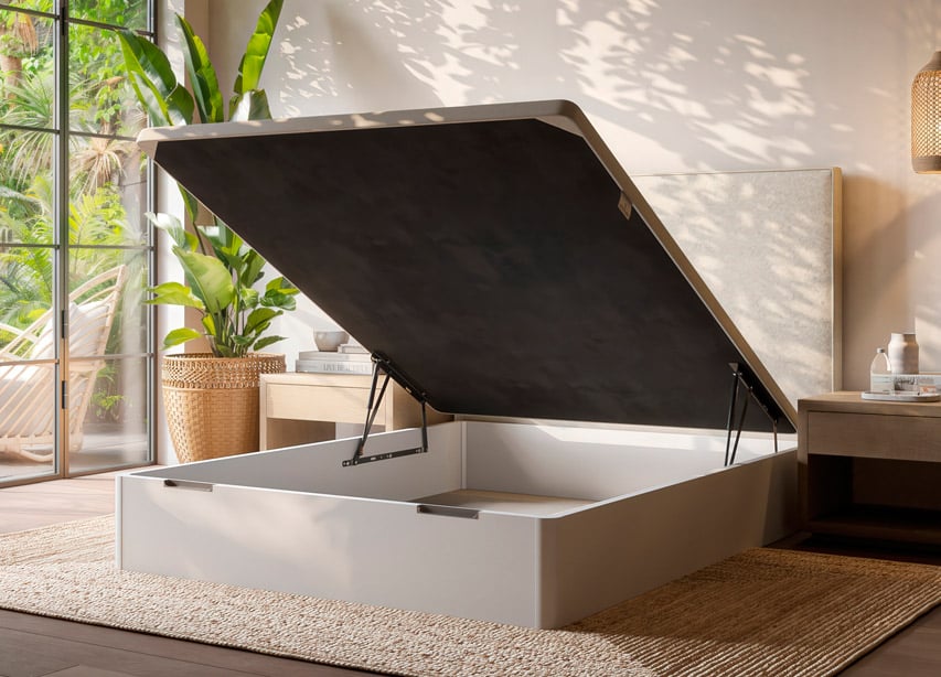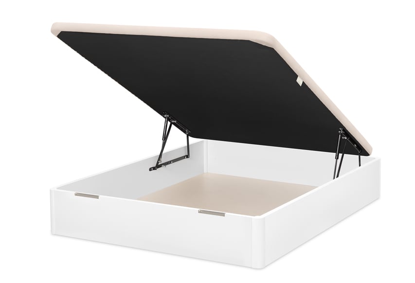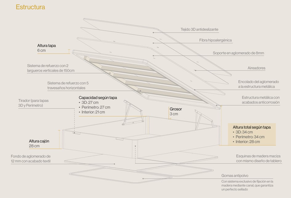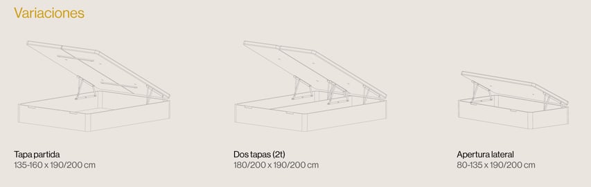 Elige en el desplegable de acabados la opción de tapa que prefieras; tapizada en tejido 3D o con el perímetro tapizado en tela (en este caso, tendrás que elegir las medidas con altura de 34). También puedes elegir la tapa embutida, interior. En ese caso la altura total será de 28 cm. y el hueco interior útil de 21cm. En lugar de tirador metalizado, contará con un asa de tela para favorecer la apertura. En las medidas hasta 135 cm. puedes elegir la apertura lateral.